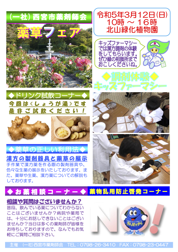 2023/03/04 薬草フェアのお知らせ下記の通り薬草フェアを開催いたします。子どもの調剤体験コーナー、しょうが湯の試飲、お薬相談コーナーなどを予定しております。お時間の合う方、ご興味のある方はぜひお越しください。
