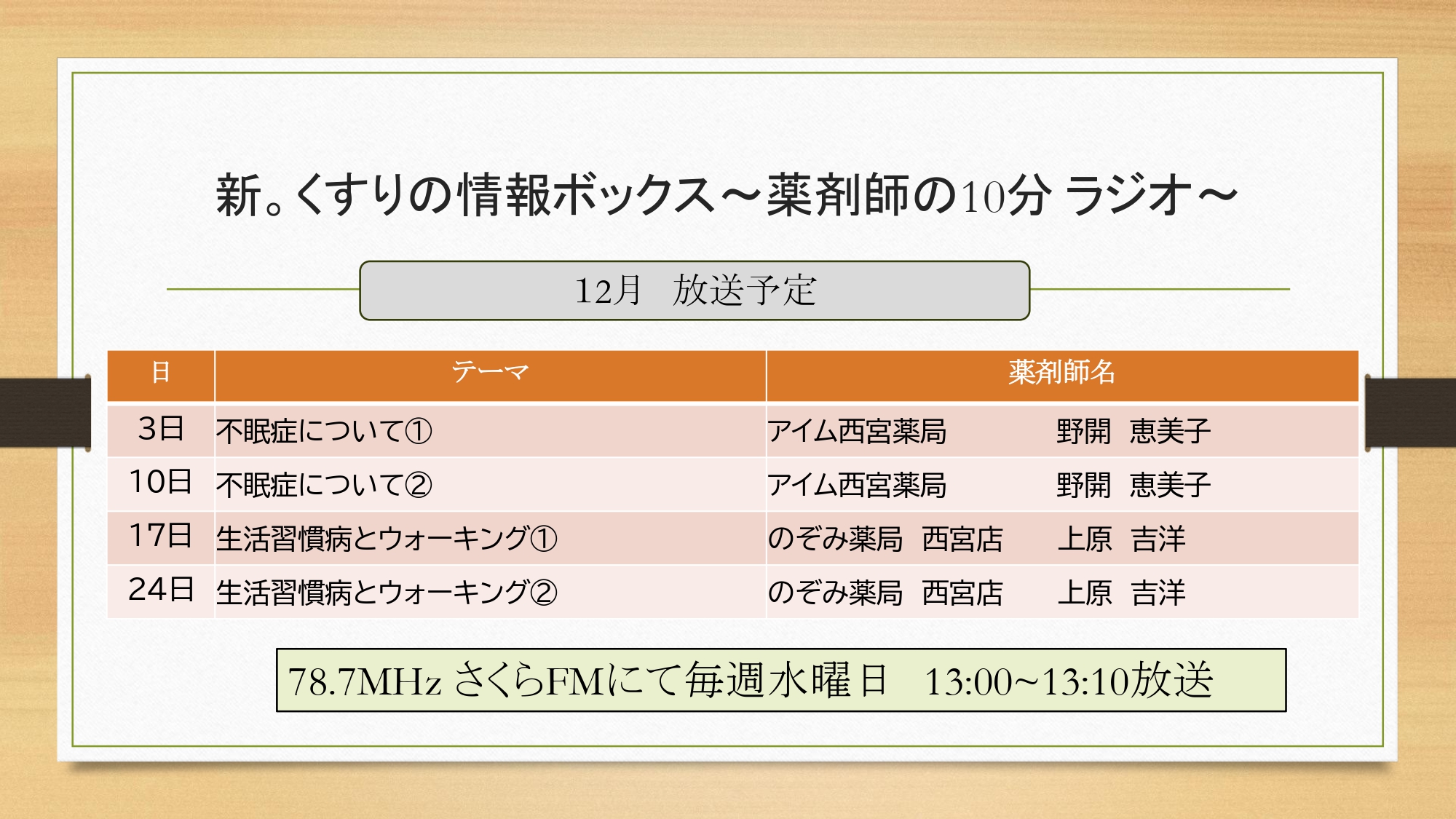 さくらFM「新。くすりの情報ボックス」12月放送スケジュール